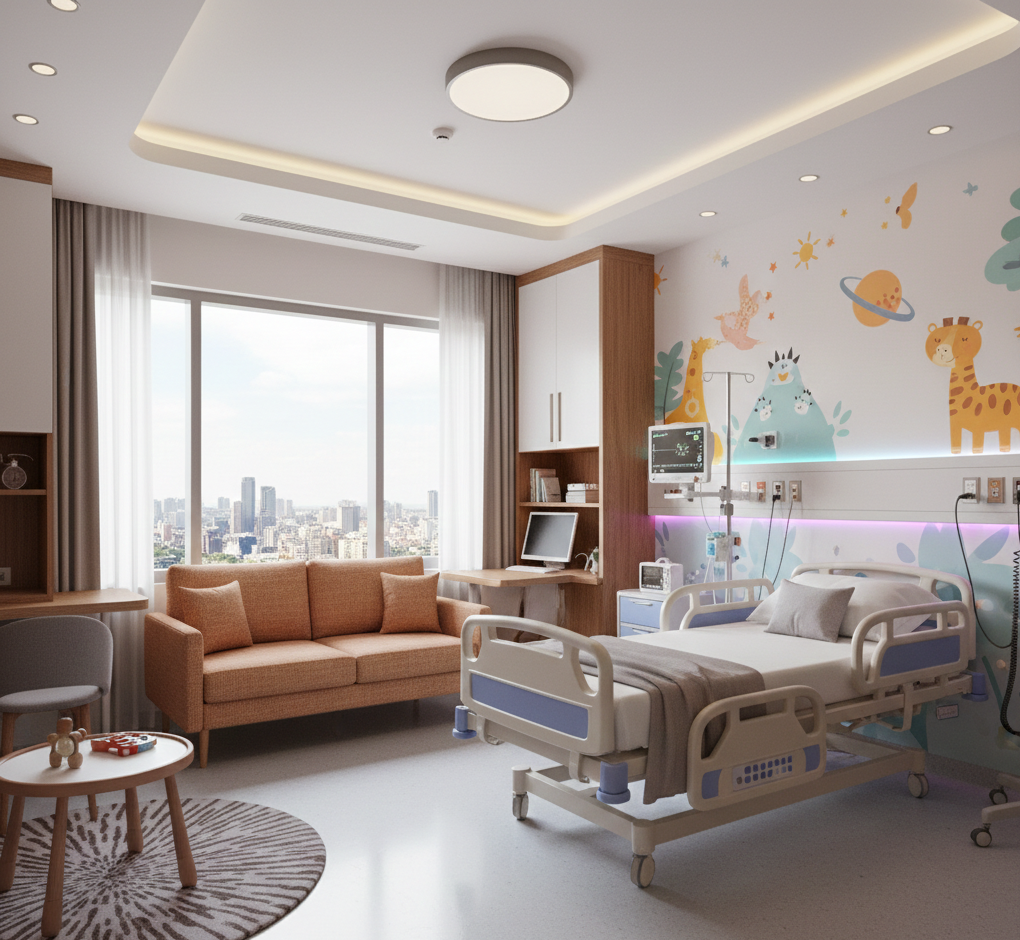Child-friendly hospital design with NICU, pediatric ICU, and specialized treatment areas